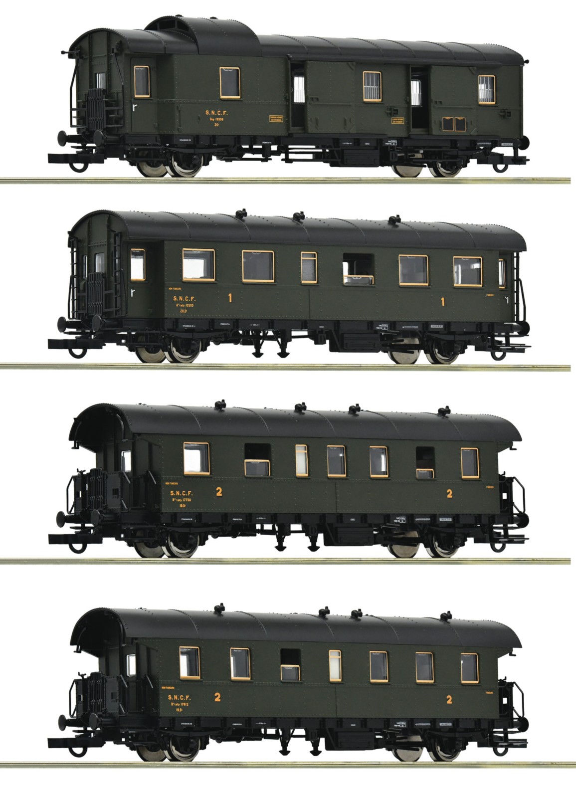 Ensemble de wagons avec quatre voitures de passagers (ex DRG « Donnerbüchse ») des Chemins de fer nationaux français.